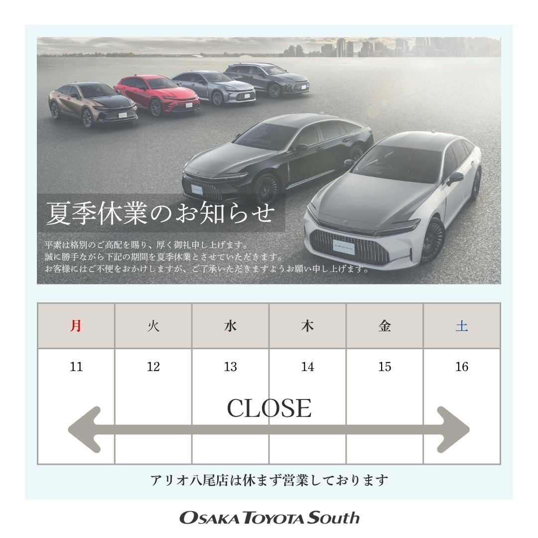 夏季休暇のお知らせ 2025.08.10 2025年夏季休業のお知らせ 大阪トヨタSouth 大阪トヨタSouth 住之江店です 🍉 いつもブログをご覧いただき ありがとうございます 🌻夏季休暇のお知らせ🌻 暑い日が続いておりますが、 お元気でお過ごしでしょうか? 誠に勝手ながら、 以下の期間を 夏季休業とさせていただきます。 前の記事へ 店舗ブログ一覧に戻る 次の記事へ