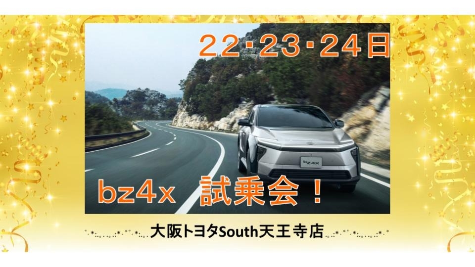 ✨✨✨bZ4X 試乗会開催します!!✨✨✨ 2025.11.17 bZ4X試乗車 電気自動車 bz4x展示車 bZ4X 試乗 みなさま こんにちは♡ 大阪トヨタSouth天王寺店のブログを ご覧いただきありがとうございます (⋈◍>◡<◍)。✧♡ ✨✨✨✨✨✨✨✨✨✨✨✨ 話題のBEV(電気自動車) ✨bZ4X✨ もうご覧になりましたか? 11月22日(土)~24日(月) 天王寺店にて ✨bZ4X 試乗会✨ 開催します!!! 低重心に設定された車体がもたらす 心地よい安定感・・・ 胸のすくような加速感と リラックスできる静かさ・・・ ぜひ、ご体感ください!!! みなさまのご来店をお待ちしております ✨✨✨✨✨✨✨✨✨✨✨✨ 前の記事へ 店舗ブログ一覧に戻る 次の記事へ