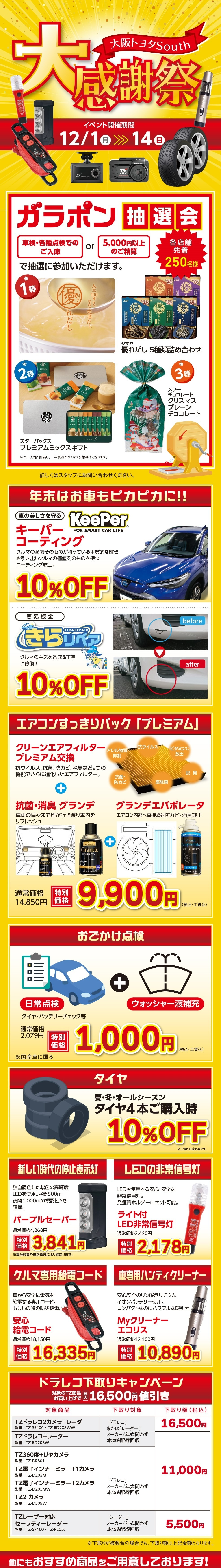 「年末大感謝祭」のお知らせ 2025.11.28 こんにちは。 大阪トヨタSouth泉佐野店です。 いつもブログをご覧頂きありがとうございます。 本日のご案内は 大阪トヨタSouth「年末大感謝」開催のお知らせです。 期間は12月1日(月)~12月14日(日)です! (2日と9日の火曜日は定休日です) 年末年始にお車で安心してお出かけになれますように お得なプランをご用意しております。 事前にご予約いただけますとスムーズに ご案内できると思います。 詳しくは当店スタッフに お気軽にお問い合わせください。 皆様のご来店を心よりお待ちしております。 前の記事へ 店舗ブログ一覧に戻る 次の記事へ