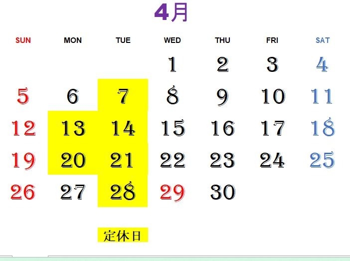 4月定休日カレンダー