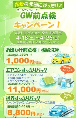 【4/18~26】おトクにGW前点検!泉大津念限定イベント開催!